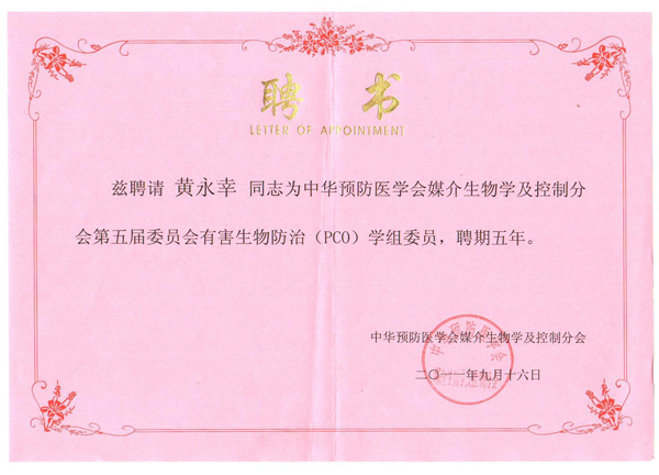2011年9月16日公司總經(jīng)理黃永幸先生當(dāng)選中華預(yù)防醫(yī)學(xué)會媒介生物學(xué)及控制分會第五屆委員會有害生物防治(PCO)學(xué)組委員。